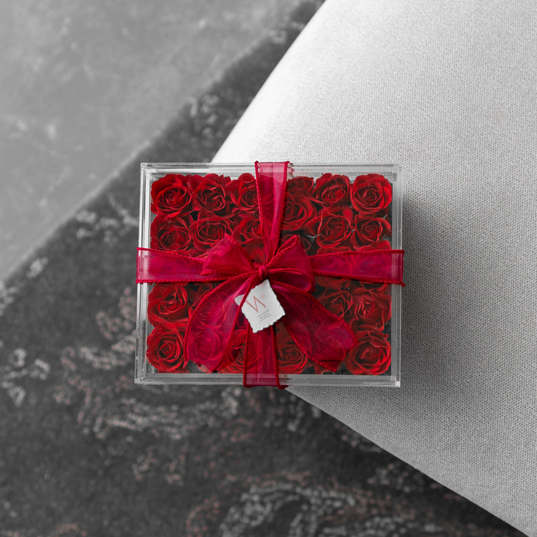 This exquisite arrangement features 35 Premium Red Roses, paired with Skimmia Red for a gracefully...