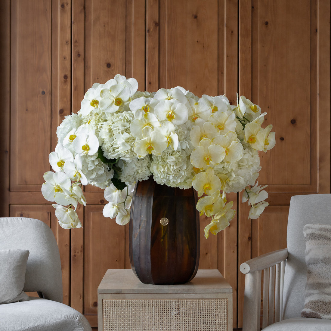 Jaune - Features 40 white hydrangea stems beautifully combined with 15 flowing orchids, presented in...