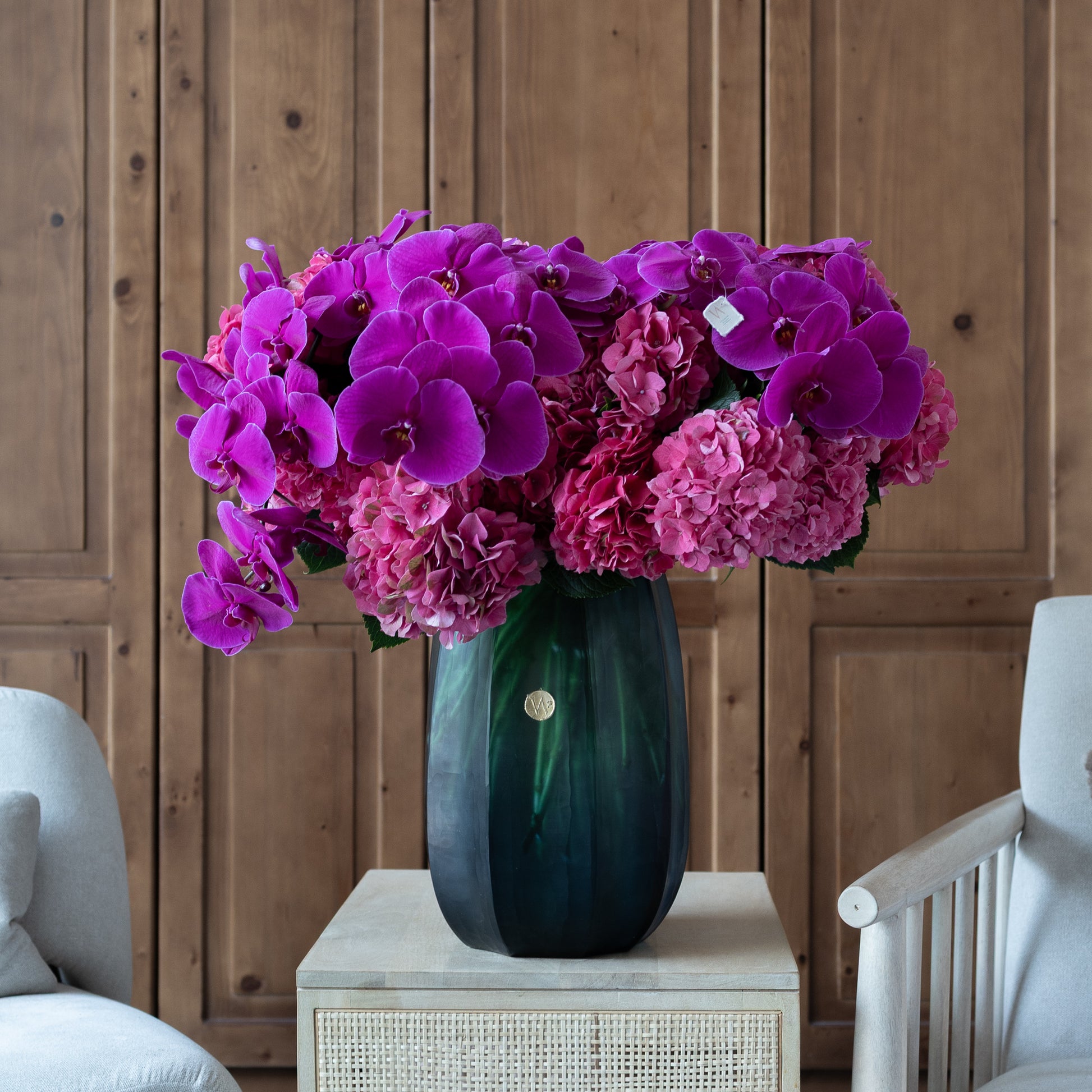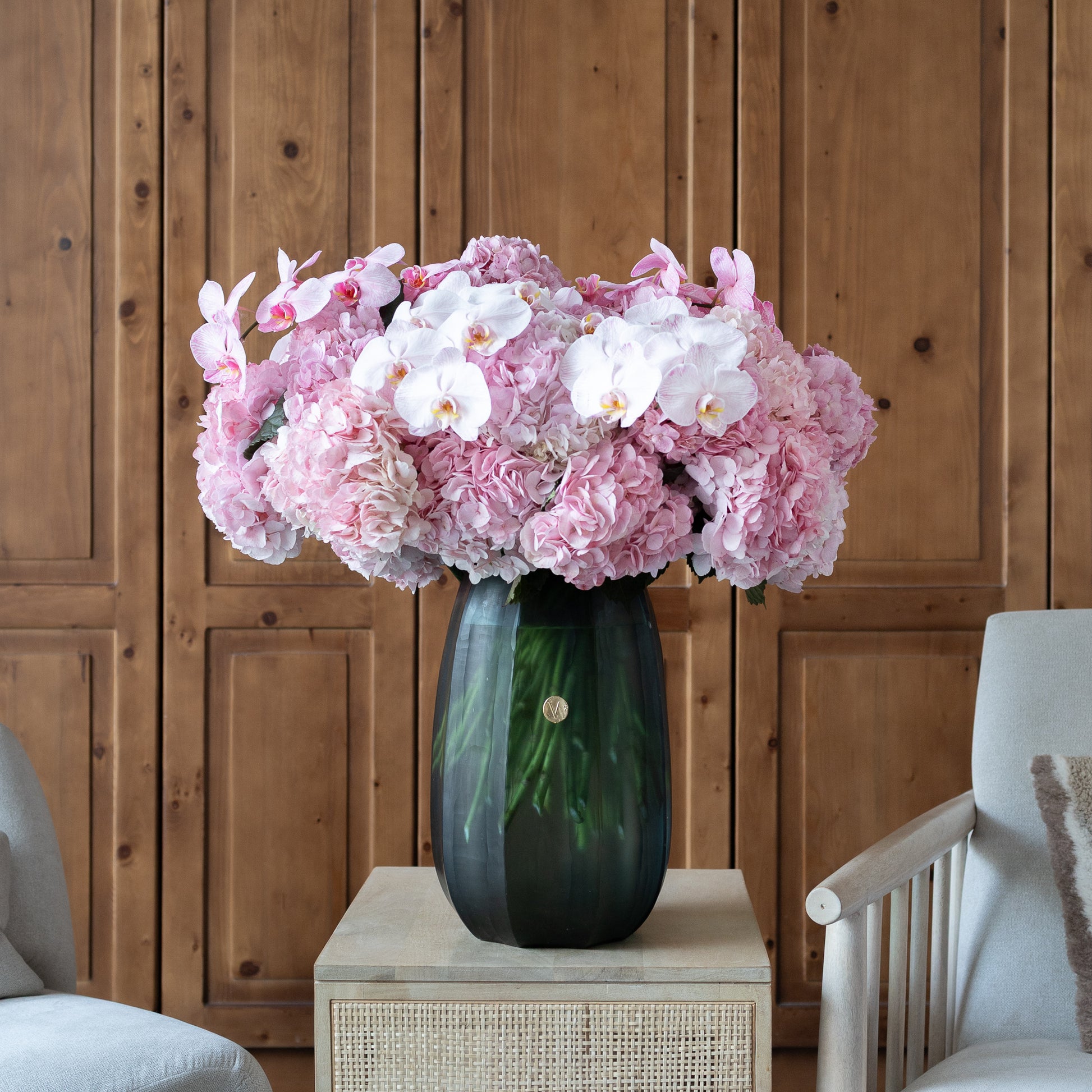 Rose - Features 40 white hydrangea stems beautifully combined with 6 flowing orchids, presented in a distinctive vase.