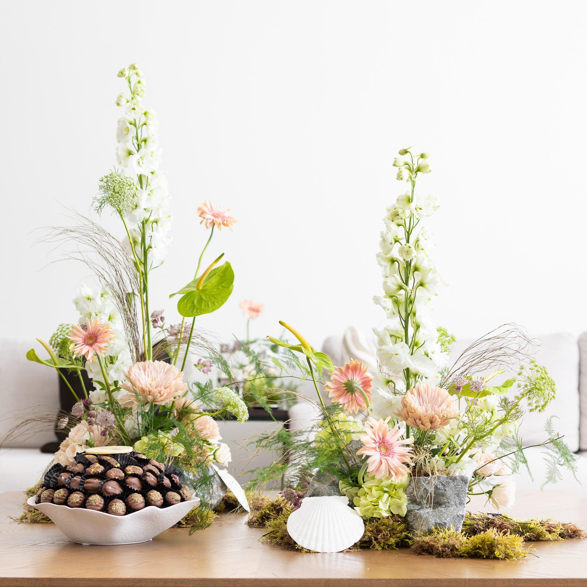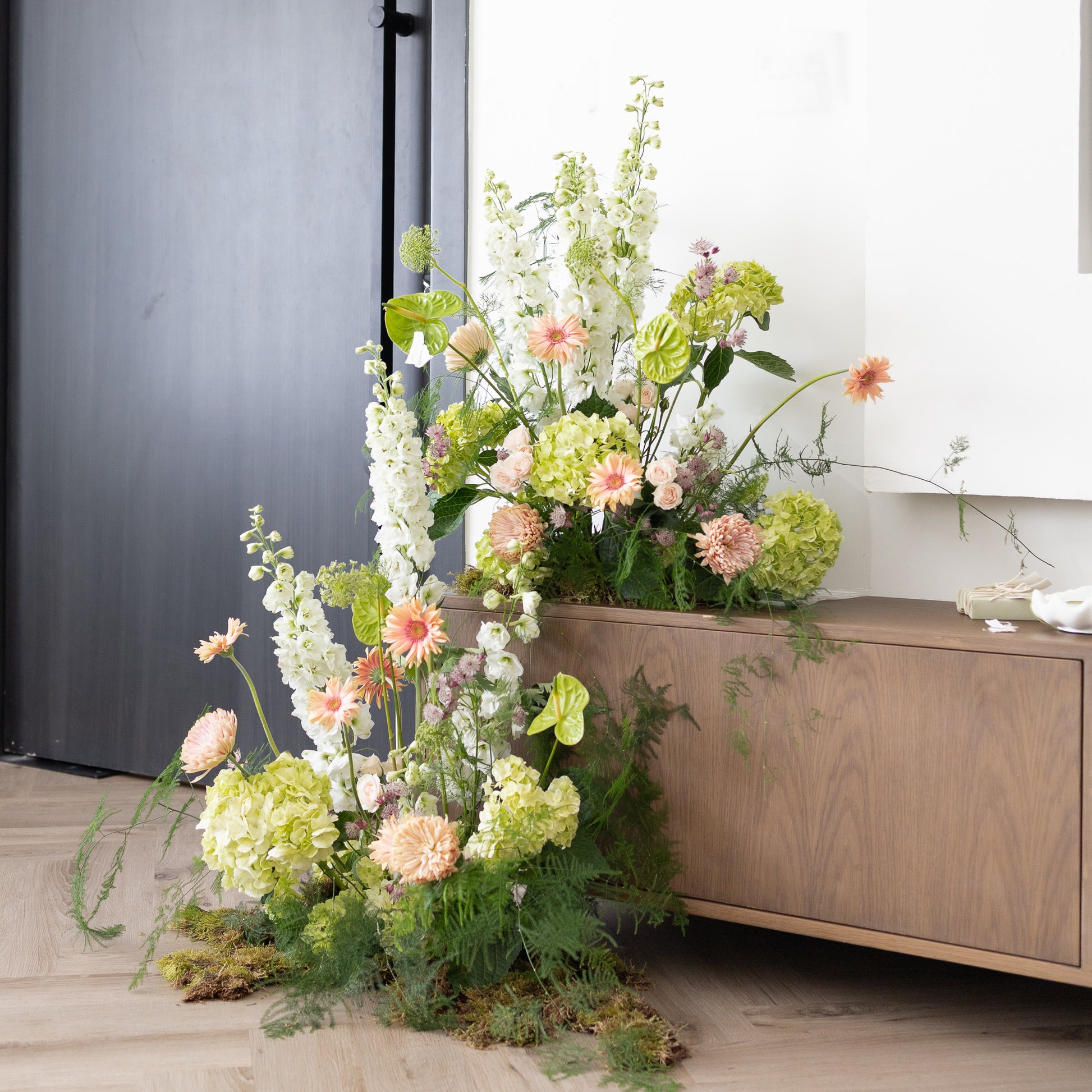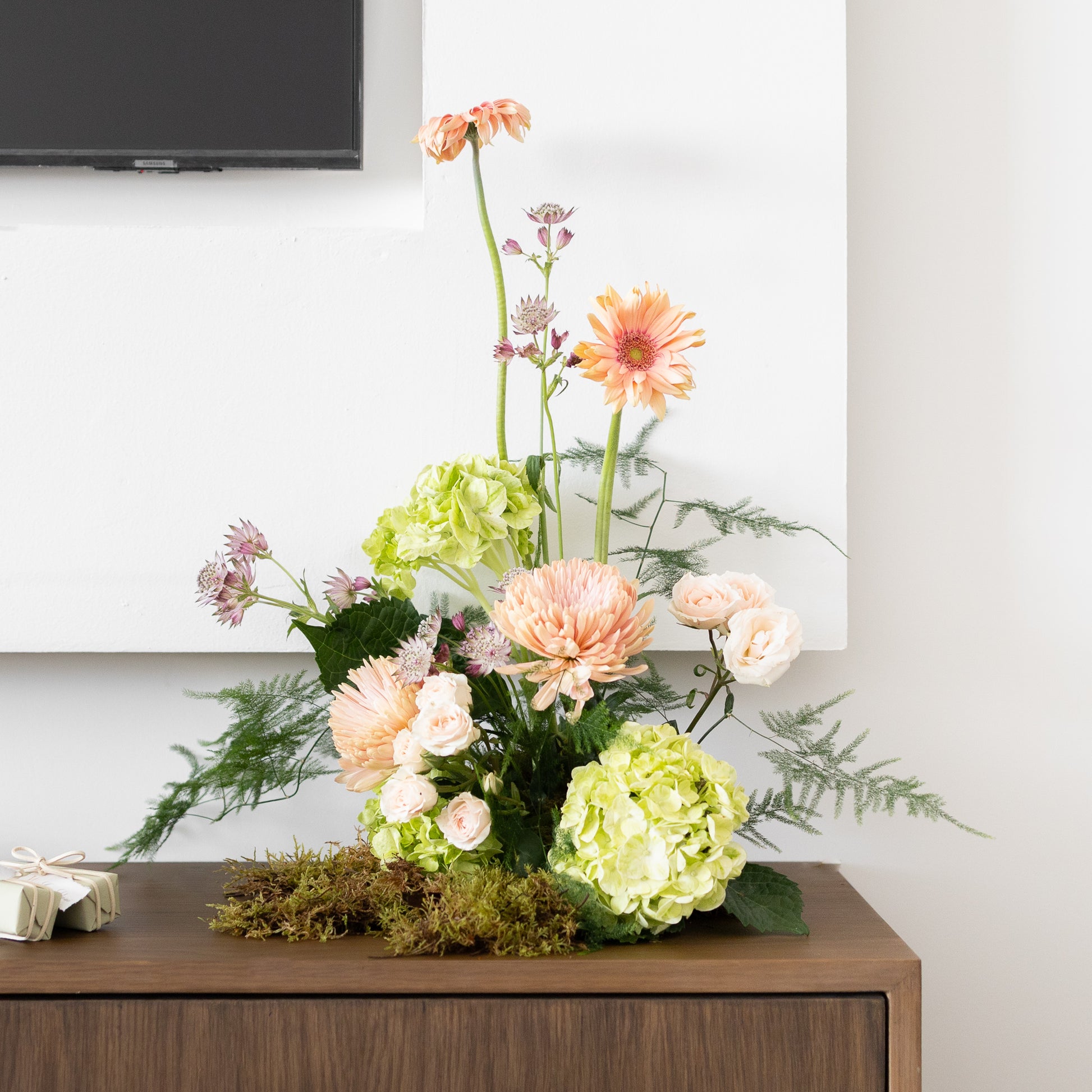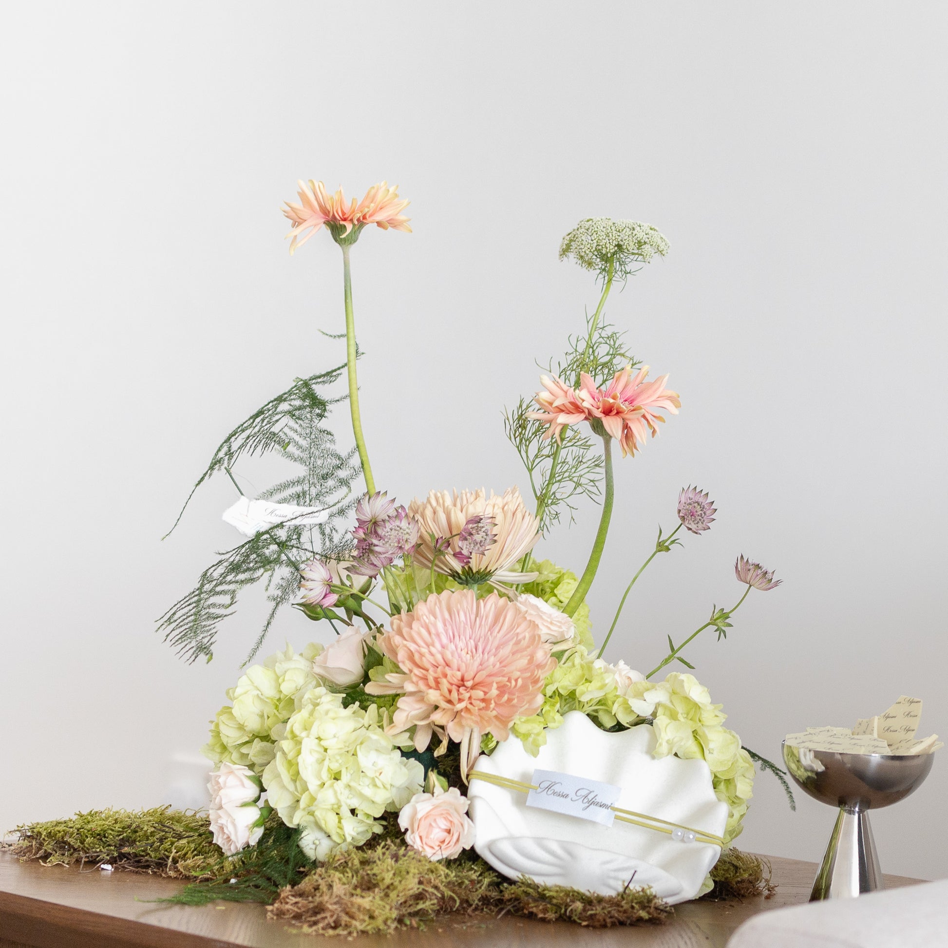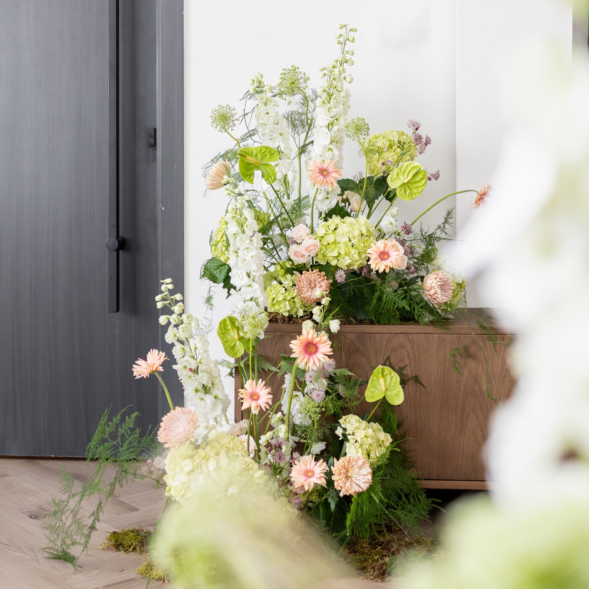 - Flowers: Asparagus, Hydrangea Pale Green, Gerbera, Ammi, Astrantia, Anthurium, Majiolika Blush, Chrysanthemum.