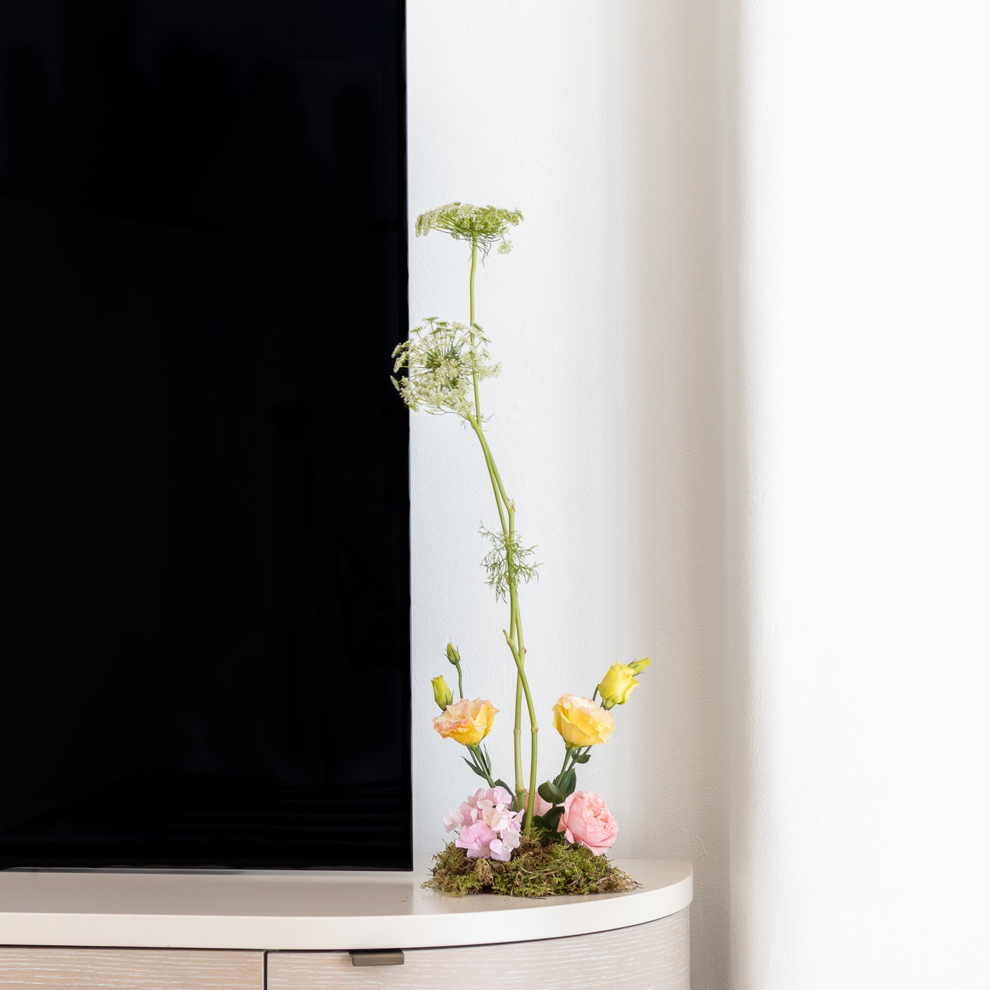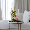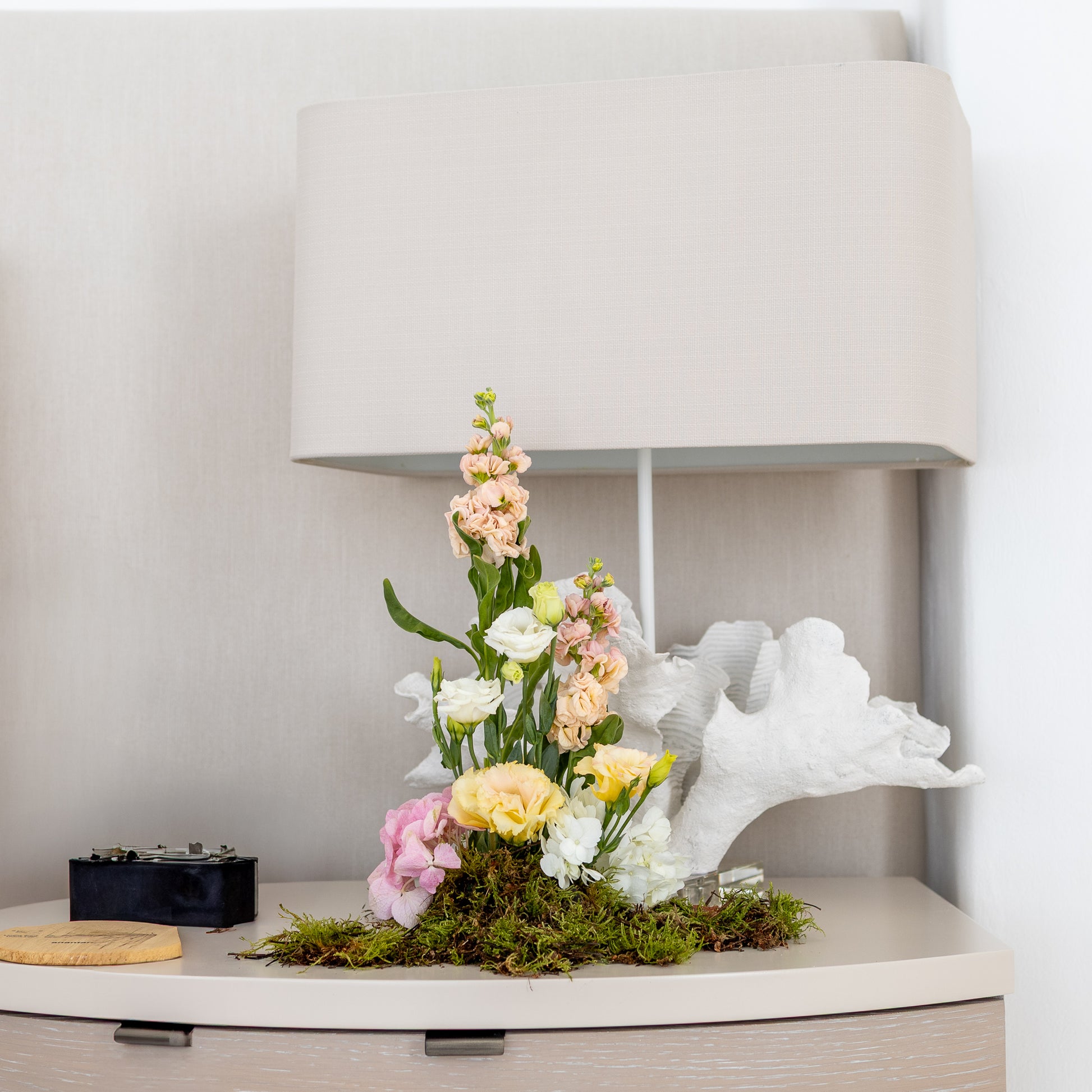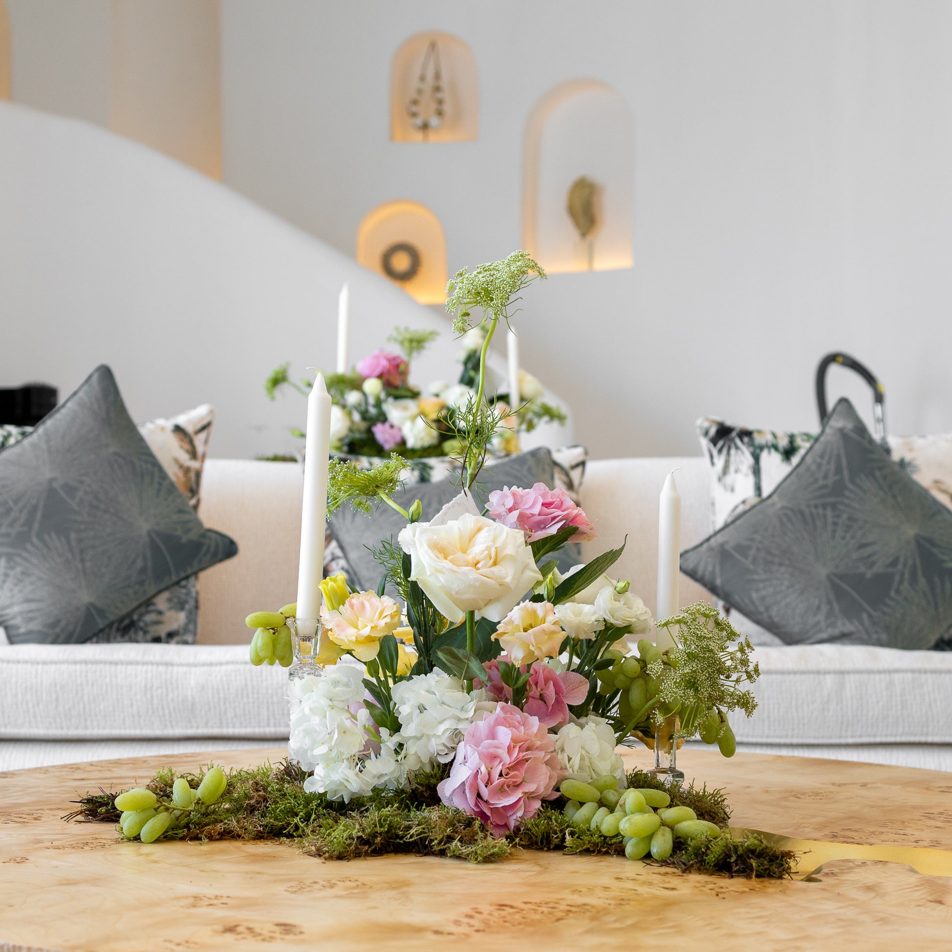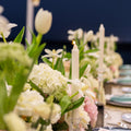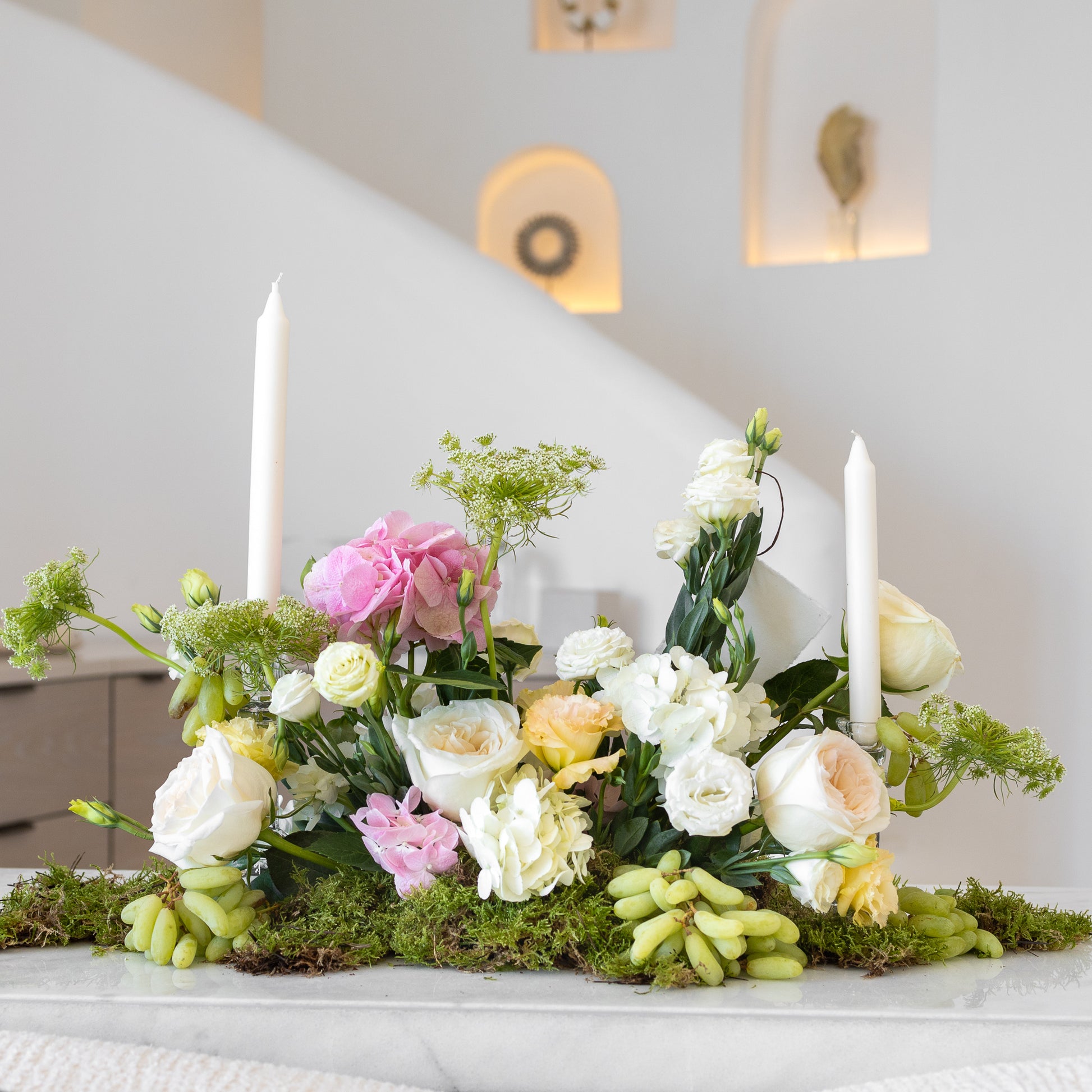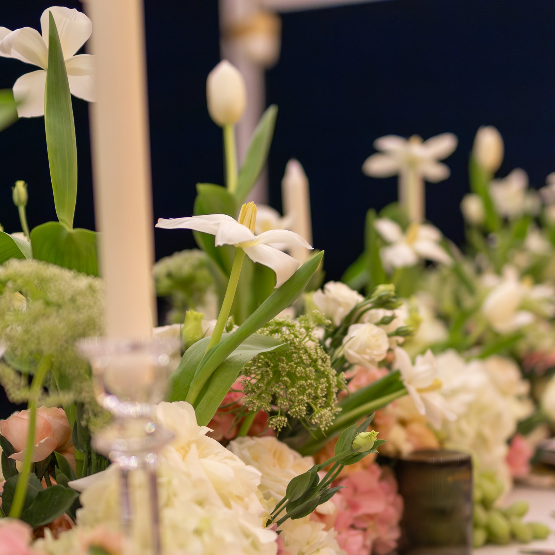 Flowers: Tulips, Ohara White, Mathiola, Lisahanthus white, Lishanthus peach, Ammi, Hydrangeas pink, Hydrangea white, Julieta peach and Grapes.